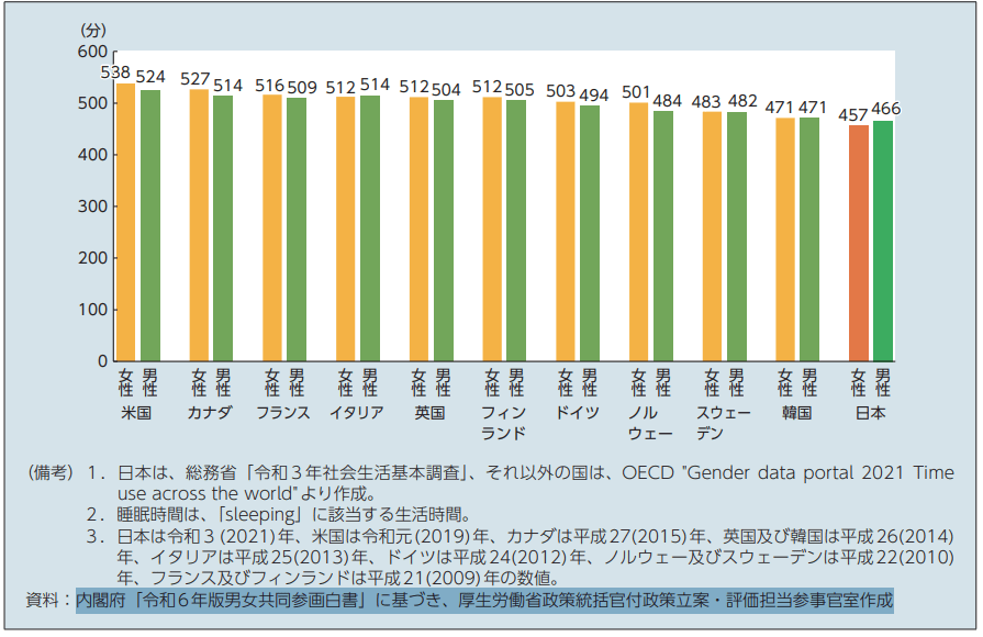 睡眠時間 男:466分 女:457分(日本人) 投稿者:池田 哲郎2025年4月12日カテゴリー:数字 内閣府「令和6年版男女共同参画白書」に基づき、厚生労働省政策統括官付政策立案・評価担当参事官室作成 令和6年版 厚生労働白書より抜粋 共有: X で共有 (新しいウィンドウで開きます) X Facebook で共有 (新しいウィンドウで開きます) Facebook LinkedIn でシェア (新しいウィンドウで開きます) LinkedIn いいね 読み込み中… 関連