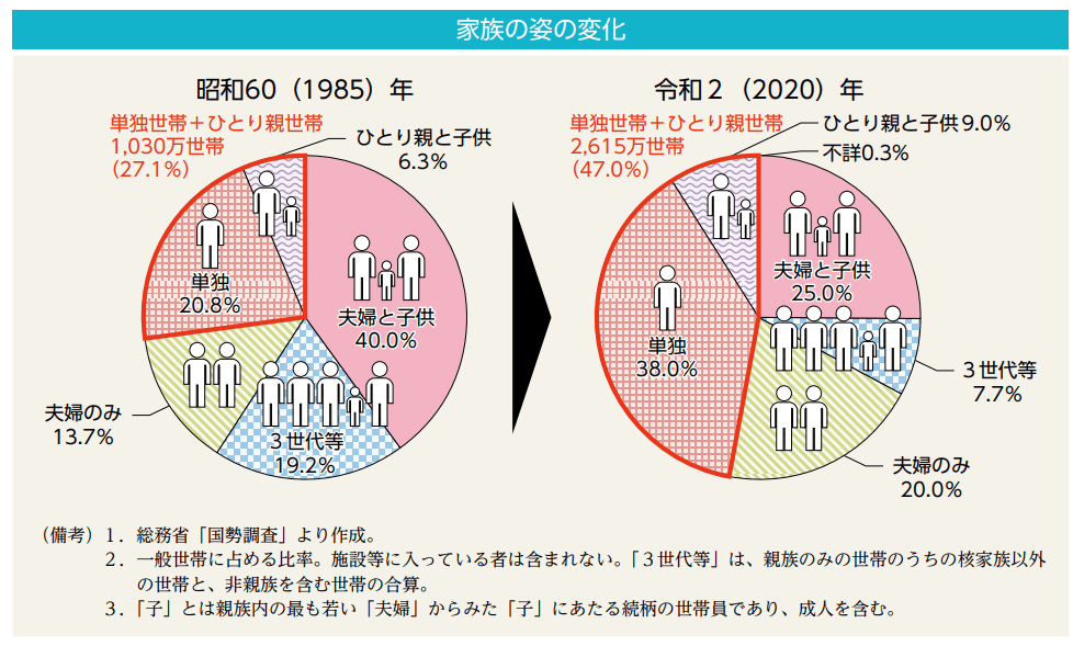 単独世帯+ひとり親世帯 2615万世帯 投稿者:池田 哲郎2025年4月22日カテゴリー:数字 男女共同参画白書 令和6年版 内閣府 男女共同参画局 抜粋 https://www.gender.go.jp/about_danjo/whitepaper/r06/zentai/pdfban.html 共有: X で共有 (新しいウィンドウで開きます) X Facebook で共有 (新しいウィンドウで開きます) Facebook LinkedIn でシェア (新しいウィンドウで開きます) LinkedIn いいね 読み込み中… 関連