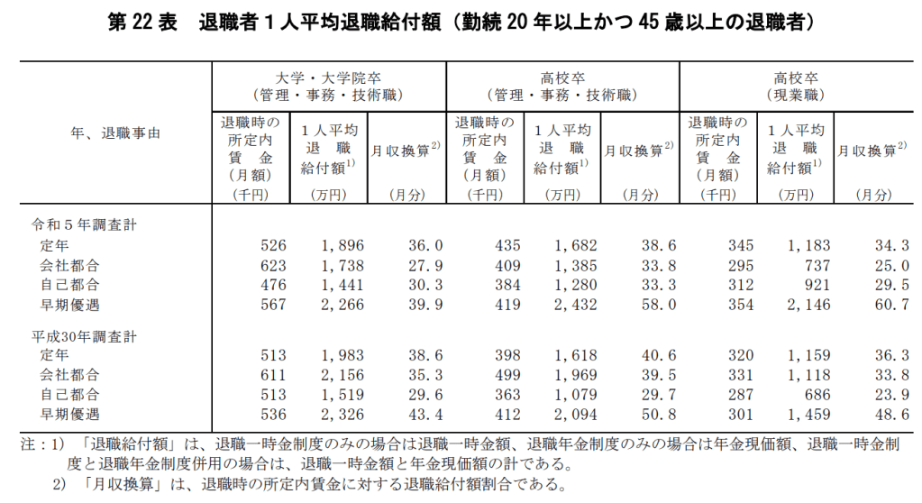 退職事由のうち「定年」退職者の退職給付額を学歴別にみると、「大学・大学院卒(管理・事務・技術職)」1,896 万円、「高校卒(管理・事務・技術職)」1,682 万円、「高校卒(現業職)」1,183 万円となっている。(第 22 表)