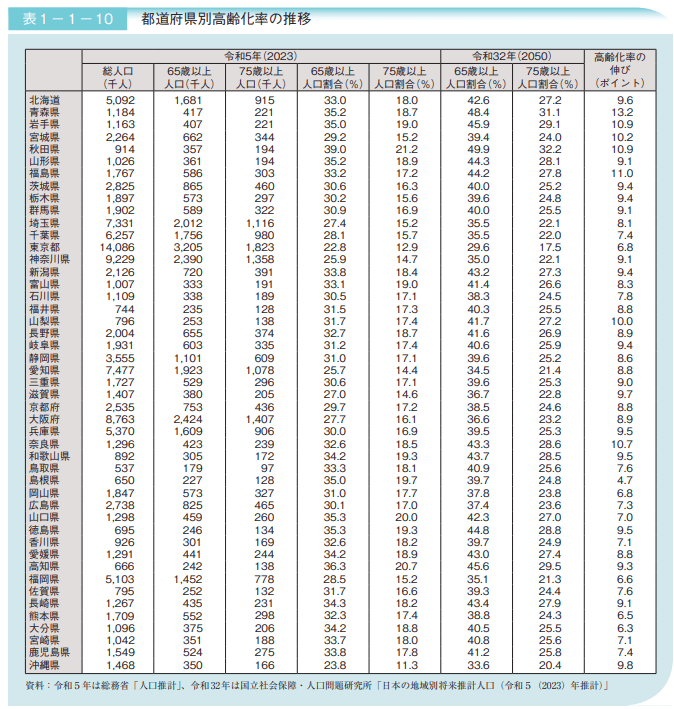 令和5年現在の高齢化率は、最も高い秋田県で39.0%、最も低い東京都で22.8%となっている。今後、高齢化率は、全ての都道府県で上昇し、令和32年には、最も高い秋田県では49.9%となり、最も低い東京都でも、29.6%に達すると見込まれている。また、首都圏を見ると、令和32年には、埼玉県の高齢化率は、令和5年の27.4%から8.1ポイント上昇し35.5%に、同じく神奈川県では25.9%から9.1ポイント上昇し35.0%になると見込まれるなど、今後、我が国の高齢化は、大都市圏を含めて全国的な広がりを見ることとなる(表1-1-10)。