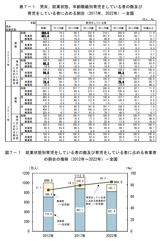 過去10年間の推移をみると、育児をしている者は、2012年から2017年にかけては112万人の増加となっているが、2017年から2022年にかけては147万人の減少となっている。このうち有業者については2012年から2017年にかけては170万人の増加となっているが、2017年から2022年にかけては60万人の減少となっている。(図7-1)