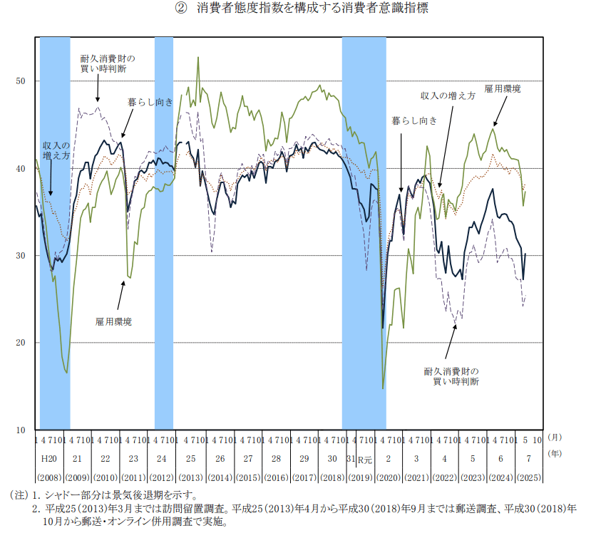 消費者態度指数を構成する各消費者意識指標について、令和7(2025)年5月の動向を前月差でみると、「暮らし向き」が 2.9 ポイント上昇し 30.2、「雇用環境」が 1.6 ポイント上昇し 37.3、「耐久消費財の買い時判断」が 1.2 ポイント上昇し 25.4、「収入の増え方」が 0.8 ポイント上昇し 38.3となった。