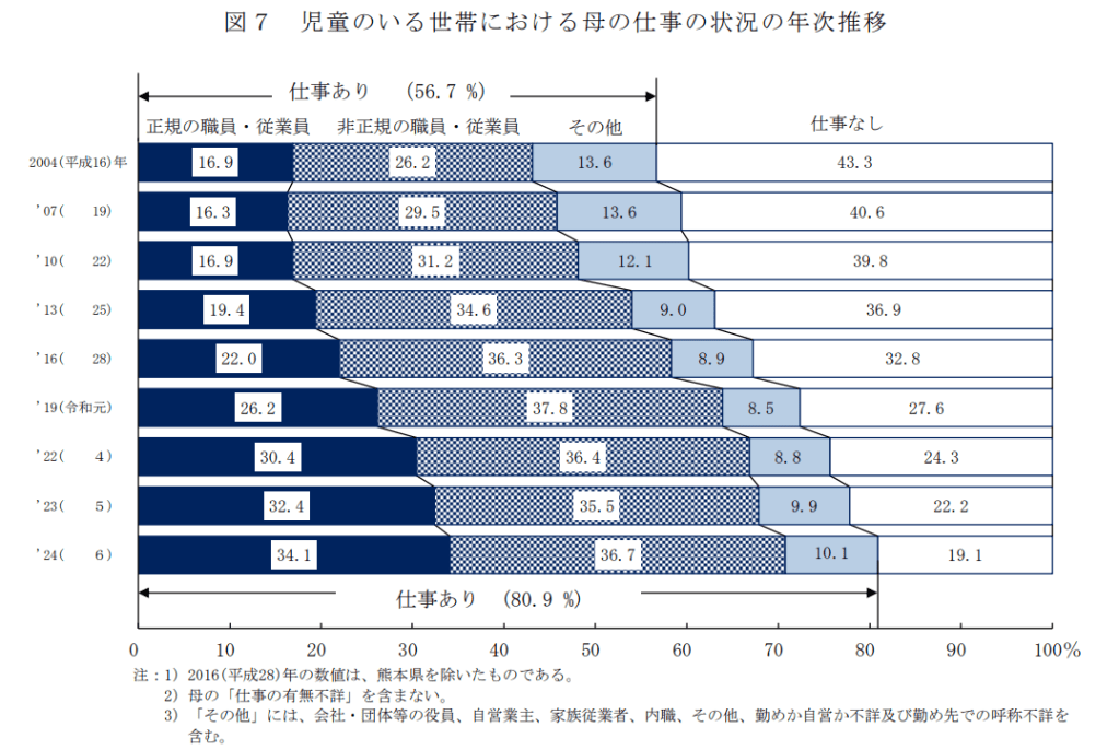 「母が仕事あり」世帯 80.9% 投稿者:池田 哲郎2025年7月9日カテゴリー:数字 2024(令和6)年 国民生活基礎調査の概況 厚生労働省 抜粋 https://www.mhlw.go.jp/toukei/saikin/hw/k-tyosa/k-tyosa24/index.html 共有: X で共有 (新しいウィンドウで開きます) X Facebook で共有 (新しいウィンドウで開きます) Facebook LinkedIn でシェア (新しいウィンドウで開きます) LinkedIn いいね 読み込み中… 関連