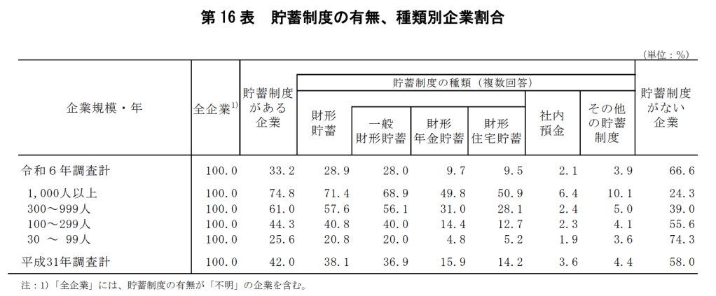 貯蓄制度がある企業割合 33.2% 投稿者:池田 哲郎2025年7月12日カテゴリー:数字 令和6年就労条件総合調査 結果の概況 厚生労働省 抜粋 https://www.mhlw.go.jp/toukei/itiran/roudou/jikan/syurou/24/index.html 共有: X で共有 (新しいウィンドウで開きます) X Facebook で共有 (新しいウィンドウで開きます) Facebook LinkedIn でシェア (新しいウィンドウで開きます) LinkedIn いいね 読み込み中… 関連