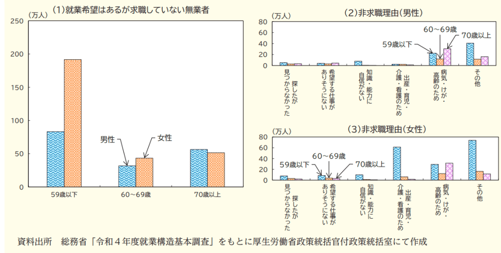 就業希望はあるが求職していない無業者 約460万人 投稿者:池田 哲郎2025年7月16日カテゴリー:数字 令和6年版 労働経済の分析 厚生労働省 抜粋 就業希望はあるが求職していない無業者は59歳以下を中心に約460万人存在。 男女ともに、高年齢層を中心に「病気・けが・高齢のため」が多く、59歳以下の女性では「出産・育児・介護・看護のため」が最も多い。「仕事を探したが見つからなかった」「希望する仕事がありそうにない」「知識・能力に自信がない」は合計すると72万人。 https://www.mhlw.go.jp/stf/wp/hakusyo/roudou/24/24-1.html 共有: X で共有 (新しいウィンドウで開きます) X Facebook で共有 (新しいウィンドウで開きます) Facebook LinkedIn でシェア (新しいウィンドウで開きます) LinkedIn いいね 読み込み中… 関連