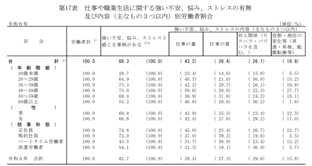 強いストレスとなっていると感じる事柄がある労働者 68.3%[令和5年調査82.7%] 投稿者:池田 哲郎2025年8月8日カテゴリー:数字 令和6年 労働安全衛生調査(実態調査) 結果の概要 厚生労働省 抜粋 https://www.mhlw.go.jp/toukei/list/r06-46-50b.html 共有: X で共有 (新しいウィンドウで開きます) X Facebook で共有 (新しいウィンドウで開きます) Facebook LinkedIn でシェア (新しいウィンドウで開きます) LinkedIn いいね 読み込み中… 関連