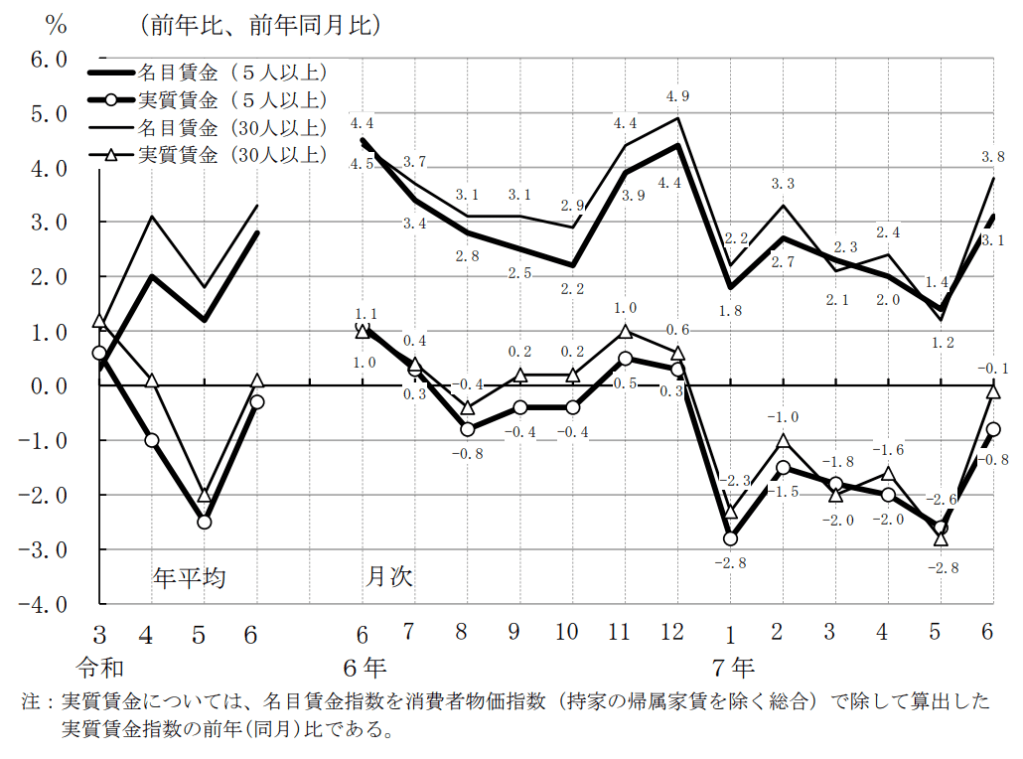 令和7年6月分 実質賃金指数(令和2年平均=100)現金給与総額 前年同月比 0.8%減 投稿者:池田 哲郎2025年8月24日カテゴリー:数字 毎月勤労統計調査 令和7年6月分結果確報 厚生労働省 抜粋 https://www.mhlw.go.jp/toukei/itiran/roudou/monthly/r07/2506r/2506r.html 共有: X で共有 (新しいウィンドウで開きます) X Facebook で共有 (新しいウィンドウで開きます) Facebook LinkedIn でシェア (新しいウィンドウで開きます) LinkedIn いいね 読み込み中… 関連