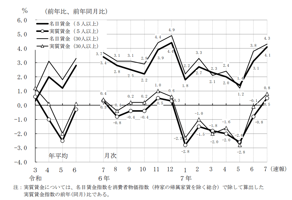 令和7年7月分実質賃金指数 115.6(前年同月比 0.5%増) 投稿者:池田 哲郎2025年9月5日カテゴリー:数字 毎月勤労統計調査 令和7年7月分結果速報 厚生労働省 抜粋 https://www.mhlw.go.jp/toukei/itiran/roudou/monthly/r07/2507p/2507p.html 共有: X で共有 (新しいウィンドウで開きます) X Facebook で共有 (新しいウィンドウで開きます) Facebook LinkedIn でシェア (新しいウィンドウで開きます) LinkedIn いいね 読み込み中… 関連