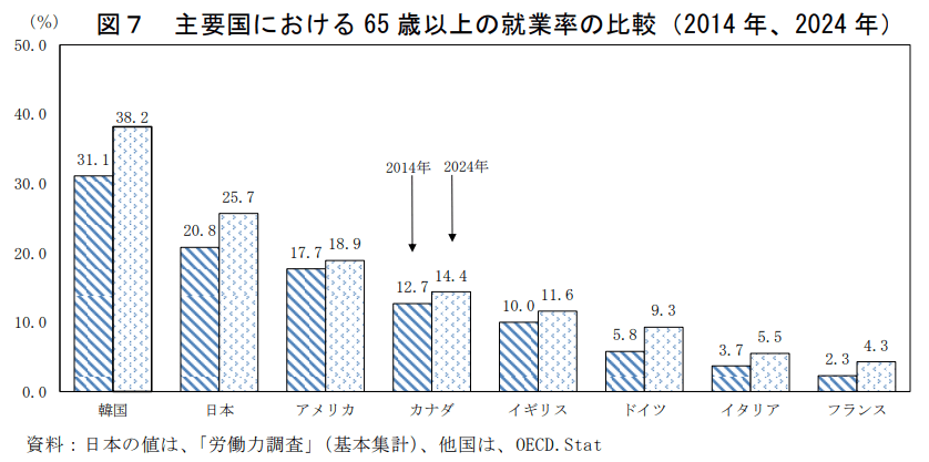 2024年 日本の65歳以上就業率 25.7% 投稿者:池田 哲郎2025年9月22日カテゴリー:数字 統計からみた我が国の高齢者-「敬老の日」にちなんで- 総務省 抜粋 https://www.stat.go.jp/data/topics/topi1460.html 共有: X で共有 (新しいウィンドウで開きます) X Facebook で共有 (新しいウィンドウで開きます) Facebook LinkedIn でシェア (新しいウィンドウで開きます) LinkedIn いいね 読み込み中… 関連