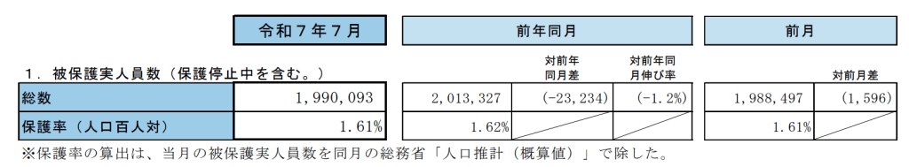 令和7年(2025)7月 被保護実人員数 1,990,093人 対前年同月比 ▲23,234人(▲1.2%)。 投稿者:池田 哲郎2025年10月8日カテゴリー:数字 生活保護の被保護者調査(令和7年7月分概数)厚生労働省 抜粋 https://www.mhlw.go.jp/toukei/saikin/hw/hihogosya/m2025/07.html 共有: X で共有 (新しいウィンドウで開きます) X Facebook で共有 (新しいウィンドウで開きます) Facebook LinkedIn でシェア (新しいウィンドウで開きます) LinkedIn いいね 読み込み中… 関連