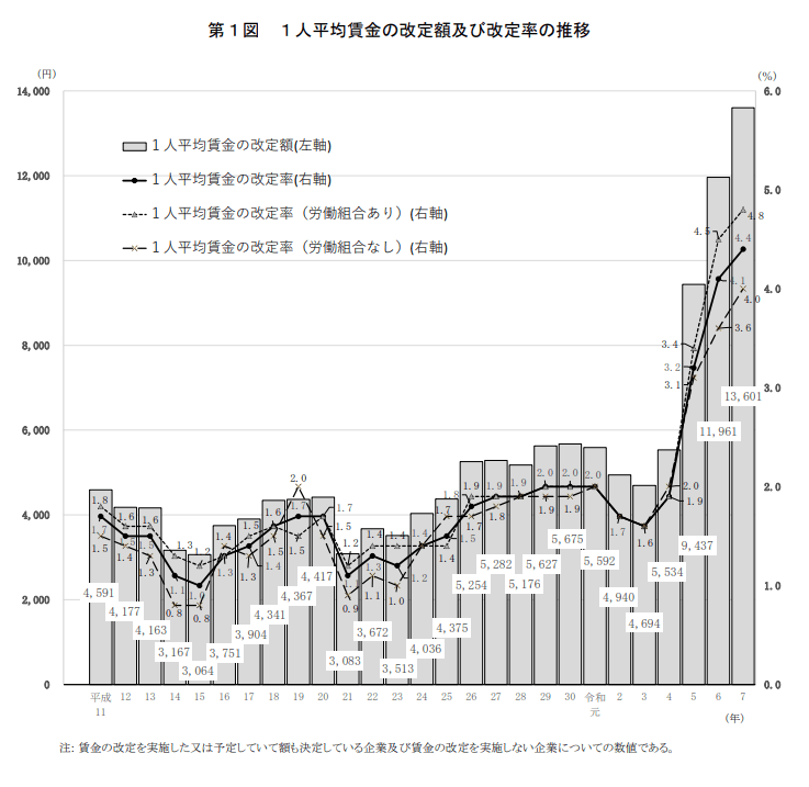 令和7(2025)年「1人平均賃金の改定額」13,601円(前年11,961円)、「1人平均賃金の改定率」4.4%(同4.1%) 投稿者:池田 哲郎2025年10月15日カテゴリー:数字 令和7(2025)年賃金引上げ等の実態に関する調査の概況 厚生労働省 抜粋 共有: X で共有 (新しいウィンドウで開きます) X Facebook で共有 (新しいウィンドウで開きます) Facebook LinkedIn でシェア (新しいウィンドウで開きます) LinkedIn いいね 読み込み中… 関連