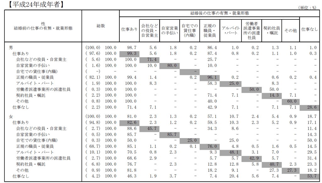 結婚前に「仕事あり」で結婚後も「仕事あり」の割合 男 99.3%、女 82.6% 投稿者:池田 哲郎2025年11月30日カテゴリー:数字 第13回21世紀成年者縦断調査(平成24年成年者)の概況 厚生労働省 抜粋 https://www.mhlw.go.jp/toukei/saikin/hw/judan/seinen26/index.html 共有: X で共有 (新しいウィンドウで開きます) X Facebook で共有 (新しいウィンドウで開きます) Facebook LinkedIn でシェア (新しいウィンドウで開きます) LinkedIn いいね 読み込み中… 関連