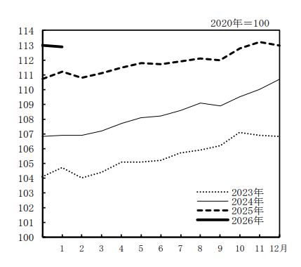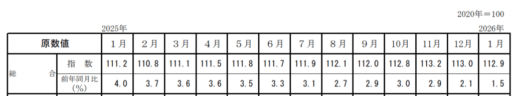 消 費 者 物価指数 総合指数 112.9前年同月比 +1.5% 前月比(季節調整値) ▲0.2% 投稿者:池田 哲郎2026年2月21日カテゴリー:数字 2020年基準 消 費 者 物価指数 全 国 2026年(令和8年 総務省 抜粋 https://www.stat.go.jp/data/cpi/sokuhou/tsuki/index-z.html 共有: X で共有 (新しいウィンドウで開きます) X Facebook で共有 (新しいウィンドウで開きます) Facebook LinkedIn で共有 (新しいウィンドウで開きます) LinkedIn いいね 読み込み中… 関連