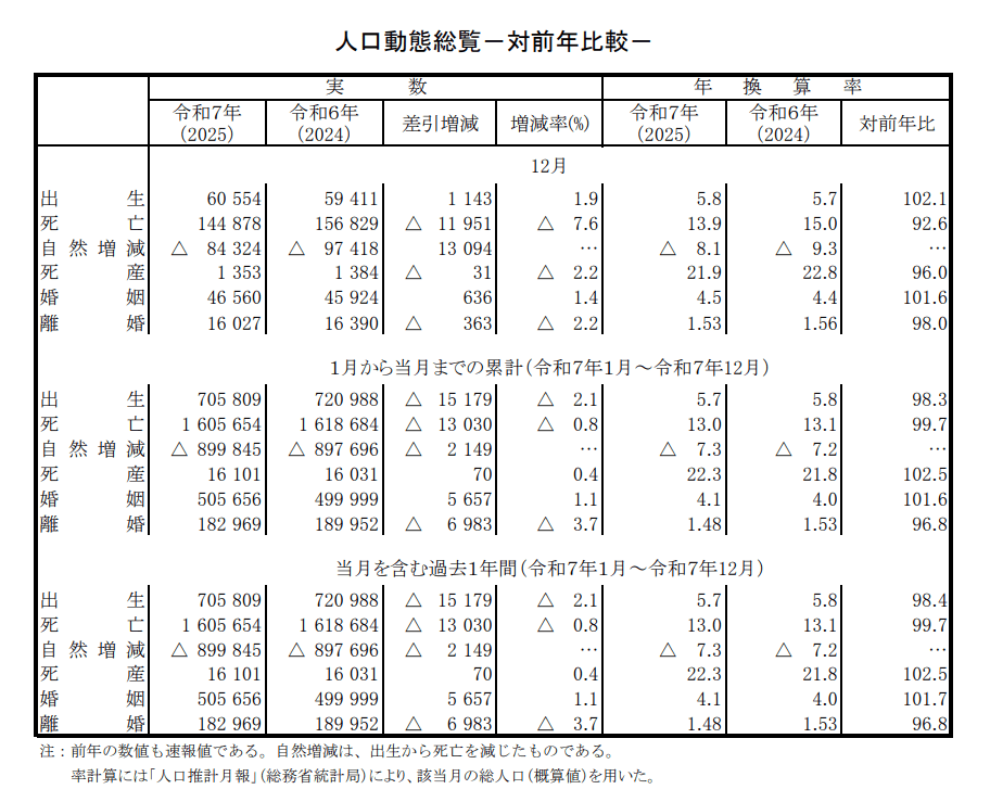 出生数は、705,809 人 10 年連続減少 (対前年 15,179 人減少 △2.1%) 投稿者:池田 哲郎2026年2月27日2026年2月27日カテゴリー:数字 人口動態統計速報(令和7(2025)年12月分)厚生労働省 抜粋 https://www.mhlw.go.jp/toukei/saikin/hw/jinkou/geppo/s2025/12.html 共有: X で共有 (新しいウィンドウで開きます) X Facebook で共有 (新しいウィンドウで開きます) Facebook LinkedIn で共有 (新しいウィンドウで開きます) LinkedIn いいね 読み込み中… 関連